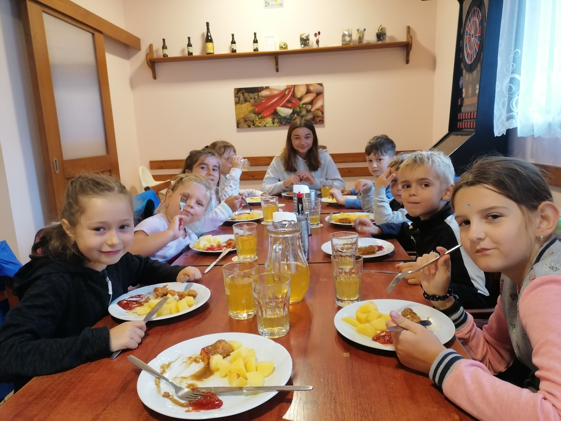 Každý den je pro děti připraven teplý oběd. Na oběd budeme chodit do místní restaurace Sokolovna. Jídelníček je zdravý a pestrý. Dostatek pití během celého dne je samozřejmostí.